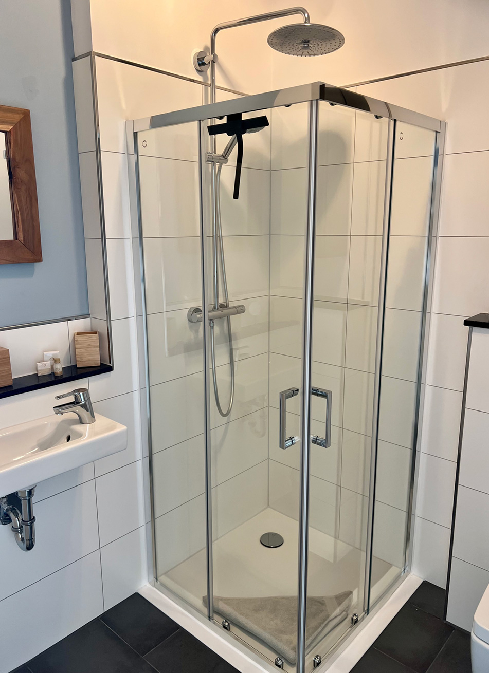 Badewanne, Ebenerdige Dusche, WC, Spiegel, Fön, Handtuchhalter