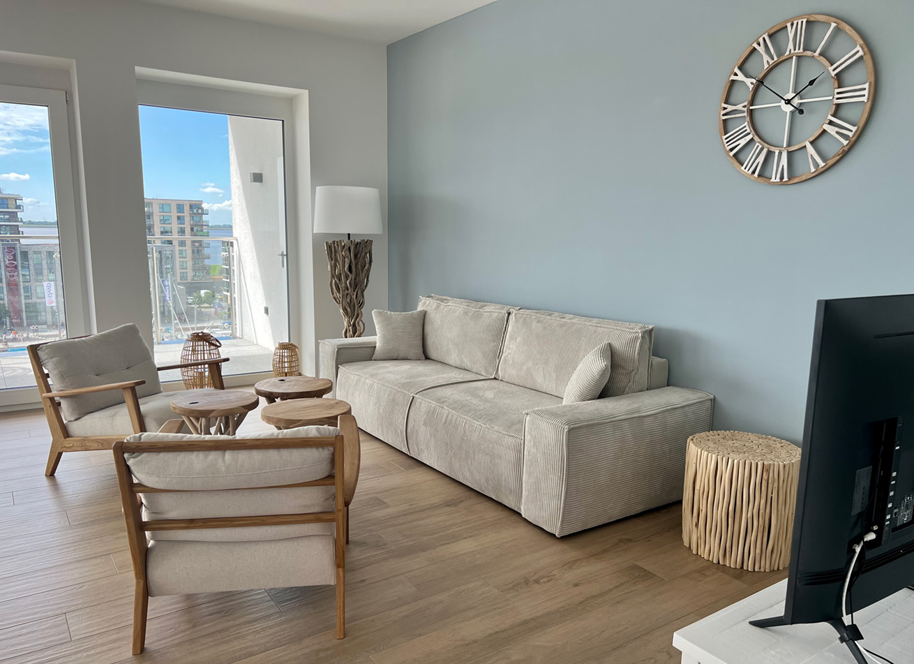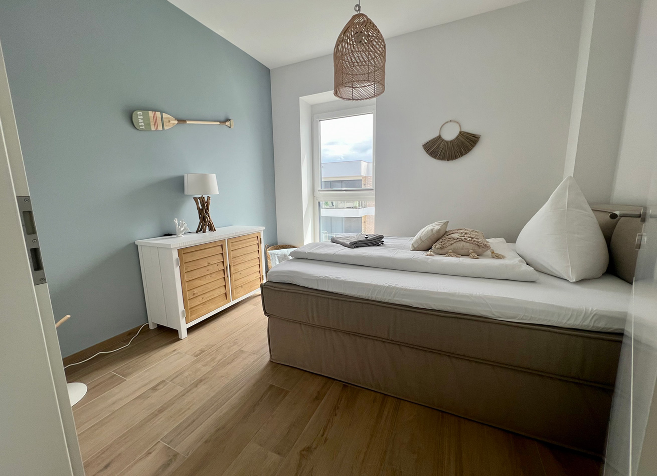 Zwei Schlafzimmer und eine bequeme Doppelschlafcouch im Wohnzimmer bescheren bis zu 6 Personen einen traumhaften Aufenthalt in der Seestadt.